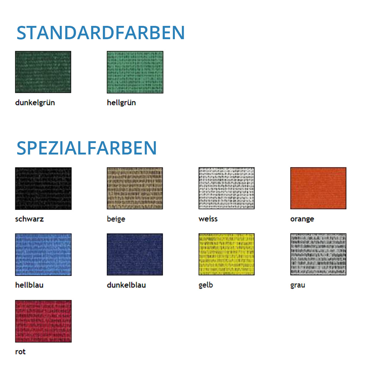 Die Tennisblenden sind in 11 verschiedenen Farben erhältlich. Hellgrün und dunkelgrün sind Standardfarben. Das durchschnittliche Gewicht beträgt 200 g/m2. Die Tennisblenden sind rundherum verstärkt und standardmäßig alle 50 cm geöst.