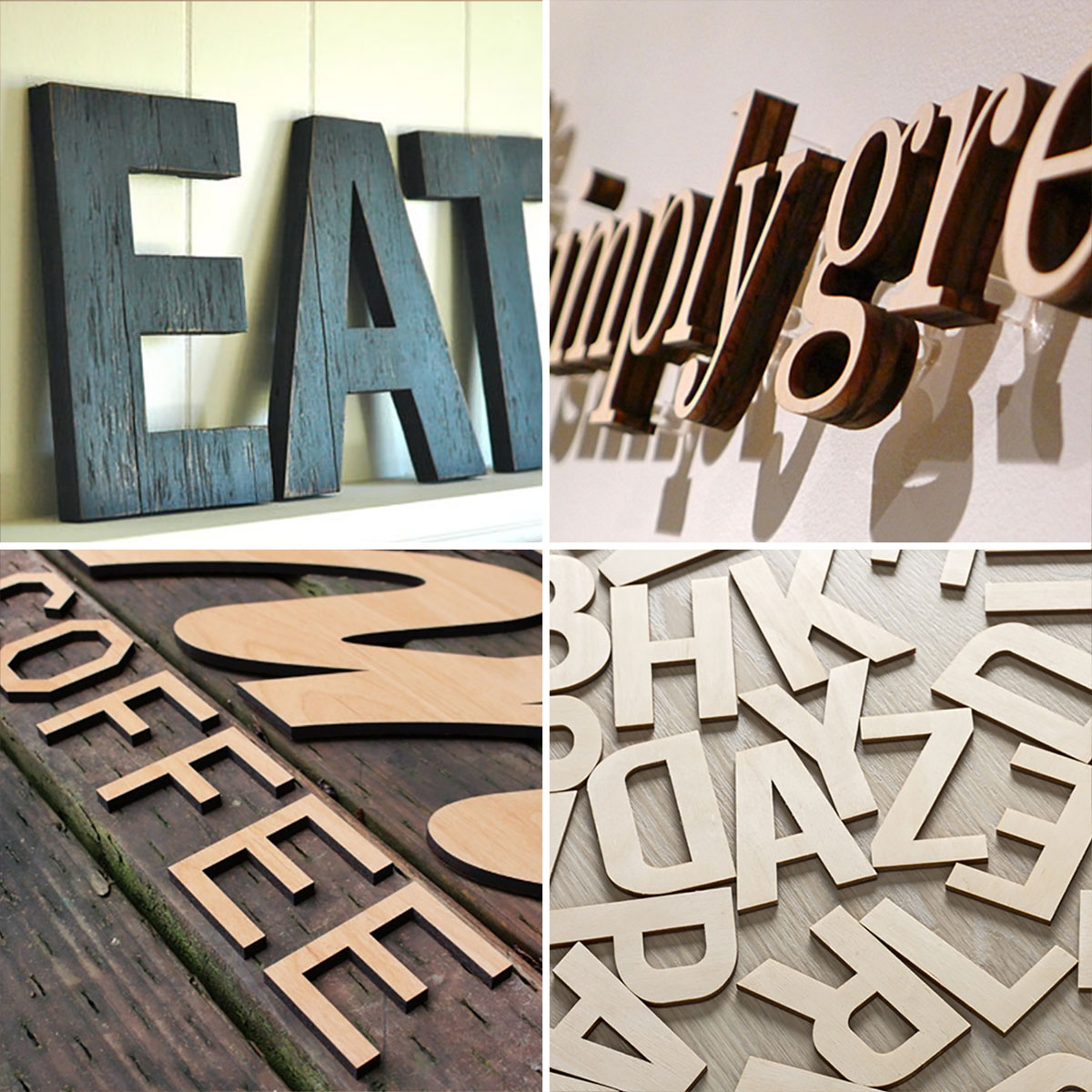 Buchstaben aus Naturholzplatten 3-Schicht. Sämtliche Holzwerkstoffe werden mittels Laser geschnitten.