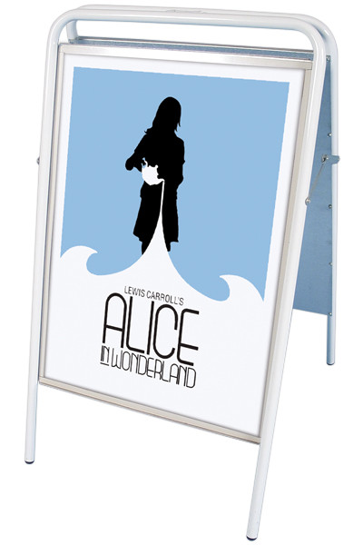 Kundenstopper aus 22 mm Stahlrohr, phosphatiert und polyesterlackiert. Rostfreie und unlackierte Alu-Zink Rückplatten. Entspiegelte APET Frontplatten mit Magnet.
