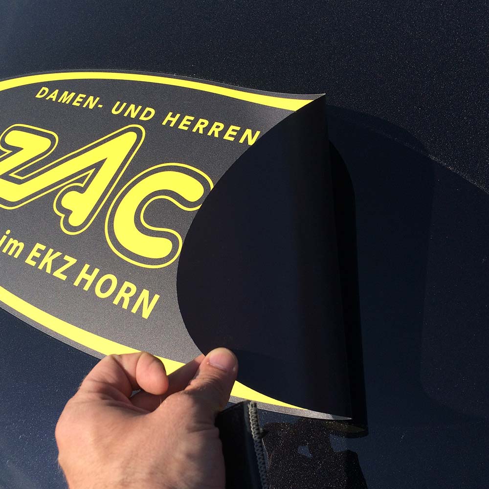 Magnetfolien bedruckt haften auf ferromagnetischen Untergründen z.B. Fahrzeugen oder Blechtafeln. Bitte beachten Sie unbedingt unsere Gebrauchshinweise für Magnetfolien!