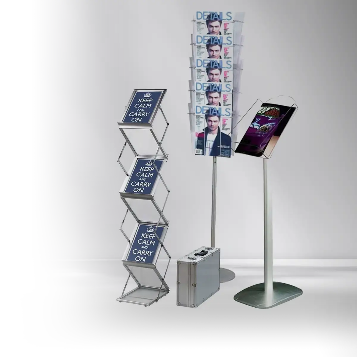 Für den mobilen oder großflächigen Einsatz eignen sich unsere Prospektständer mit mehreren Fächern und optionalen Unterteilungen – ideal für eine übersichtliche Sortierung.